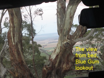 It was lovely and quiet last night at the lookout; I slept very well, but woke up at dawn – about 6.30am – and got up soon after. There was a wonderful view from bed out the windscreen – you could see Spencer Gulf and the Eyre Peninsula beyond the magnificent huge trees.